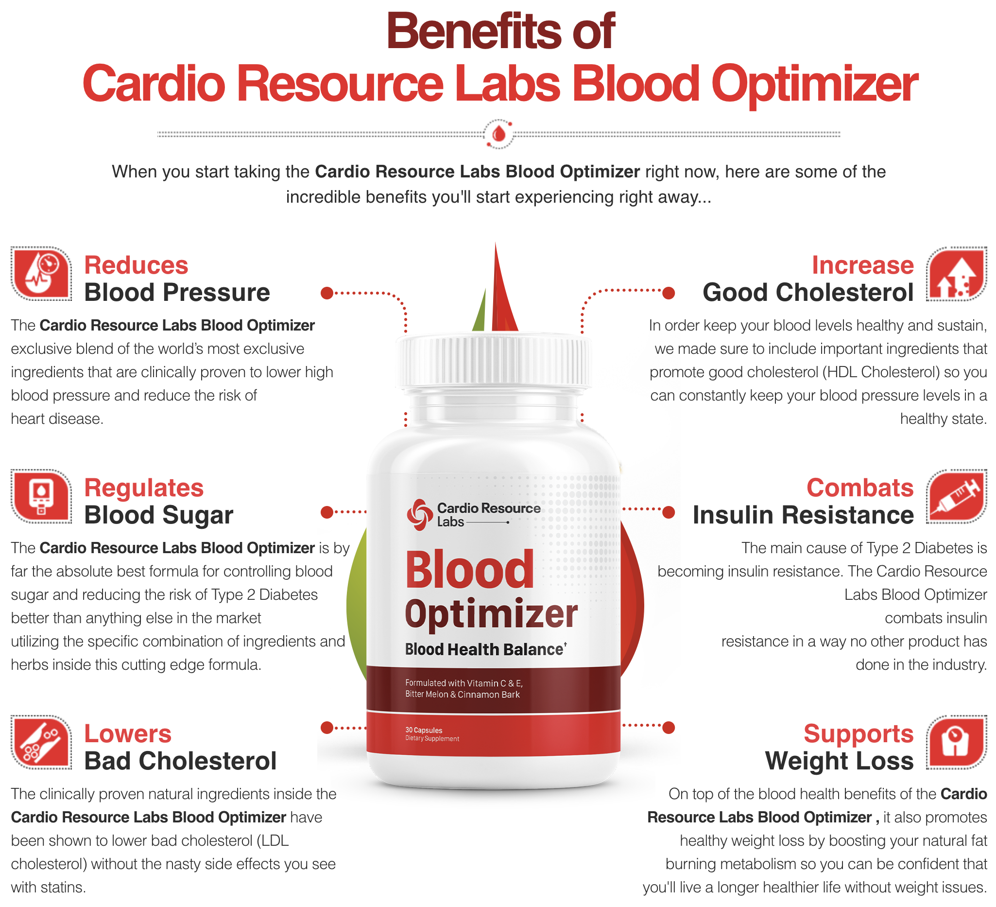 Cardio Resource Labs Blood Optimizer is a dietary supplement formulated to support cardiovascular health. It aims to balance blood sugar levels, lower LDL (bad) cholesterol, increase HDL (good) cholesterol, regulate blood pressure, and assist in weight management.